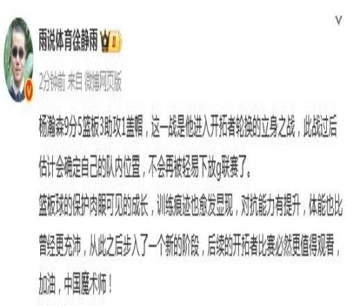 赛后,篮球评论员徐静雨发文点评:杨瀚森9分5篮板3助攻1盖帽,这一战是他进入开拓者轮换的立身之战,此战过后估计会确定自己的队内位置,不会再被轻易下放g联赛了。